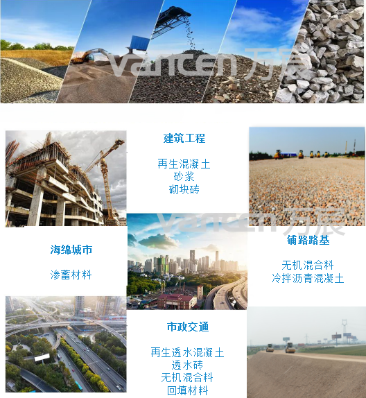 The recycled aggregate disposed by Vancen resource disposal process has high purity and fine classification, which is more convenient for the promotion and application of the recycled aggregate industry chain. Among them, 0-5mm stone and 0-5mm fine sand are used to make concrete; 0-5mm aggregates are used to make concrete bricks; 5-10mm, 10-20mm, 20-31.5mm aggregates are used to fill pits and pads, which truly realizes the double benefits of turning construction waste into treasure and realizing environmental and economic benefits.